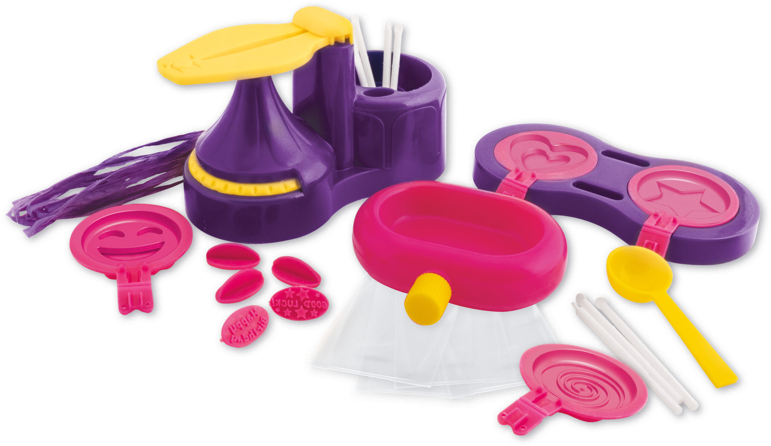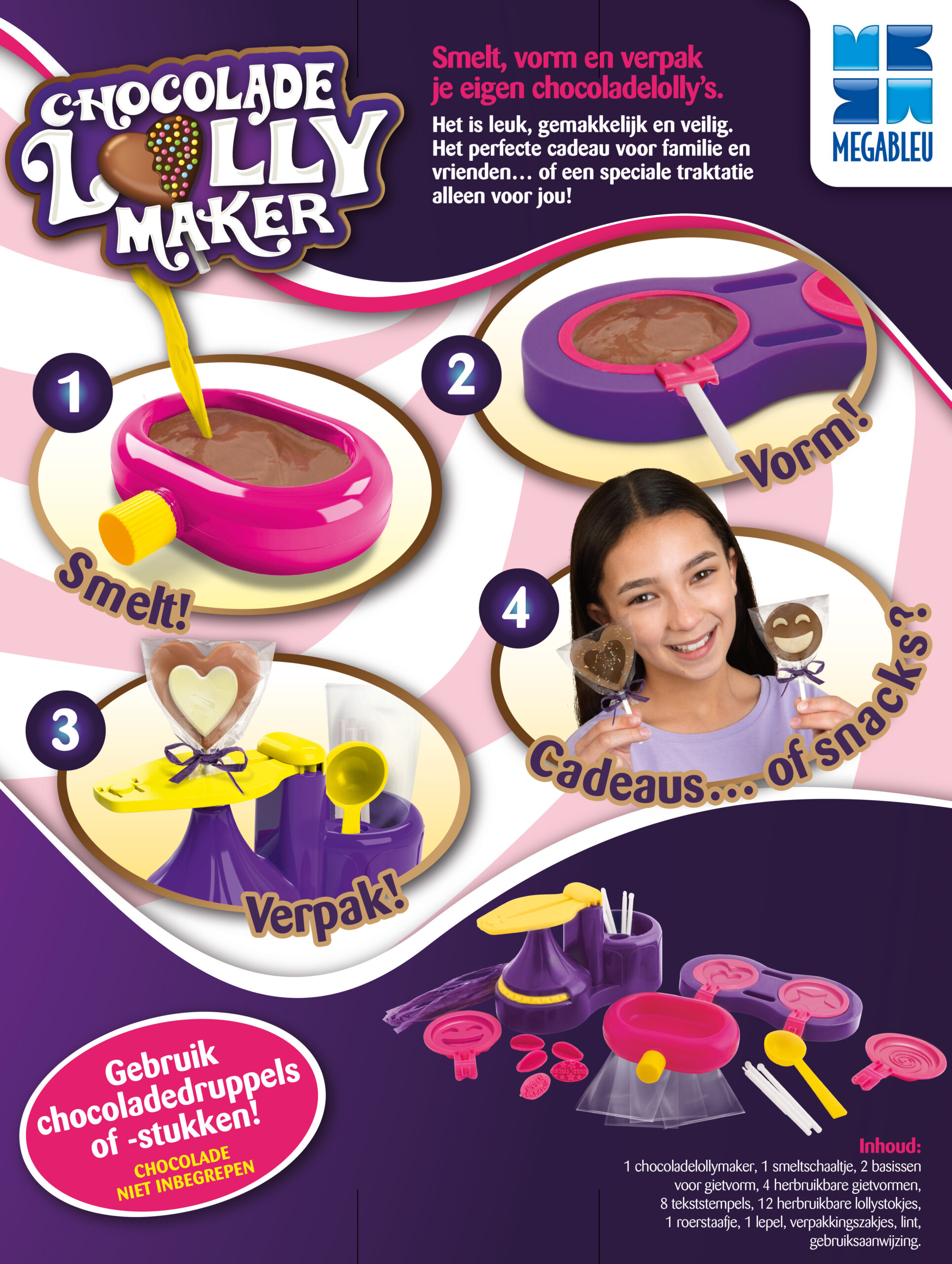1 Chocolade Lollymaker, 1 smeltschaaltje, 2 basissen voor gietvorm, 4 herbruikbare gietvormen, 8 tekst stempels, 12 herbruikbare lollystokjes, 1 roerstaafje, 1 lepel, verpakkingszakjes, lint, gebruiksaanwijzing