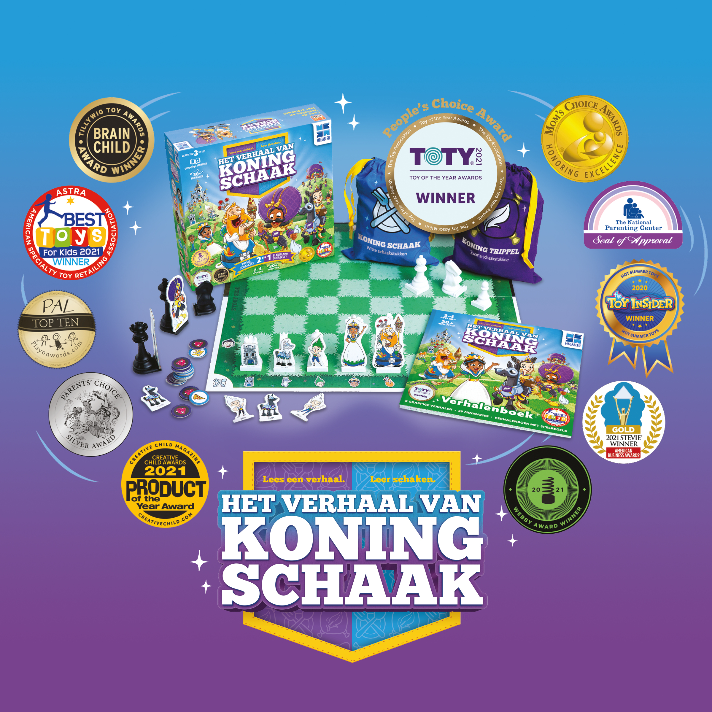 Het verhaal van Koning Schaak is een uniek en leerzaam bordspel waarmee kinderen vanaf 3 jaar spelenderwijs leren schaken. Dankzij grappige verhalen en kleurrijke illustraties begrijpen kinderen stap voor stap hoe de schaakstukken bewegen. Schaken wordt zo niet alleen leerzaam, maar ook ontzettend leuk en toegankelijk voor jong én oud.