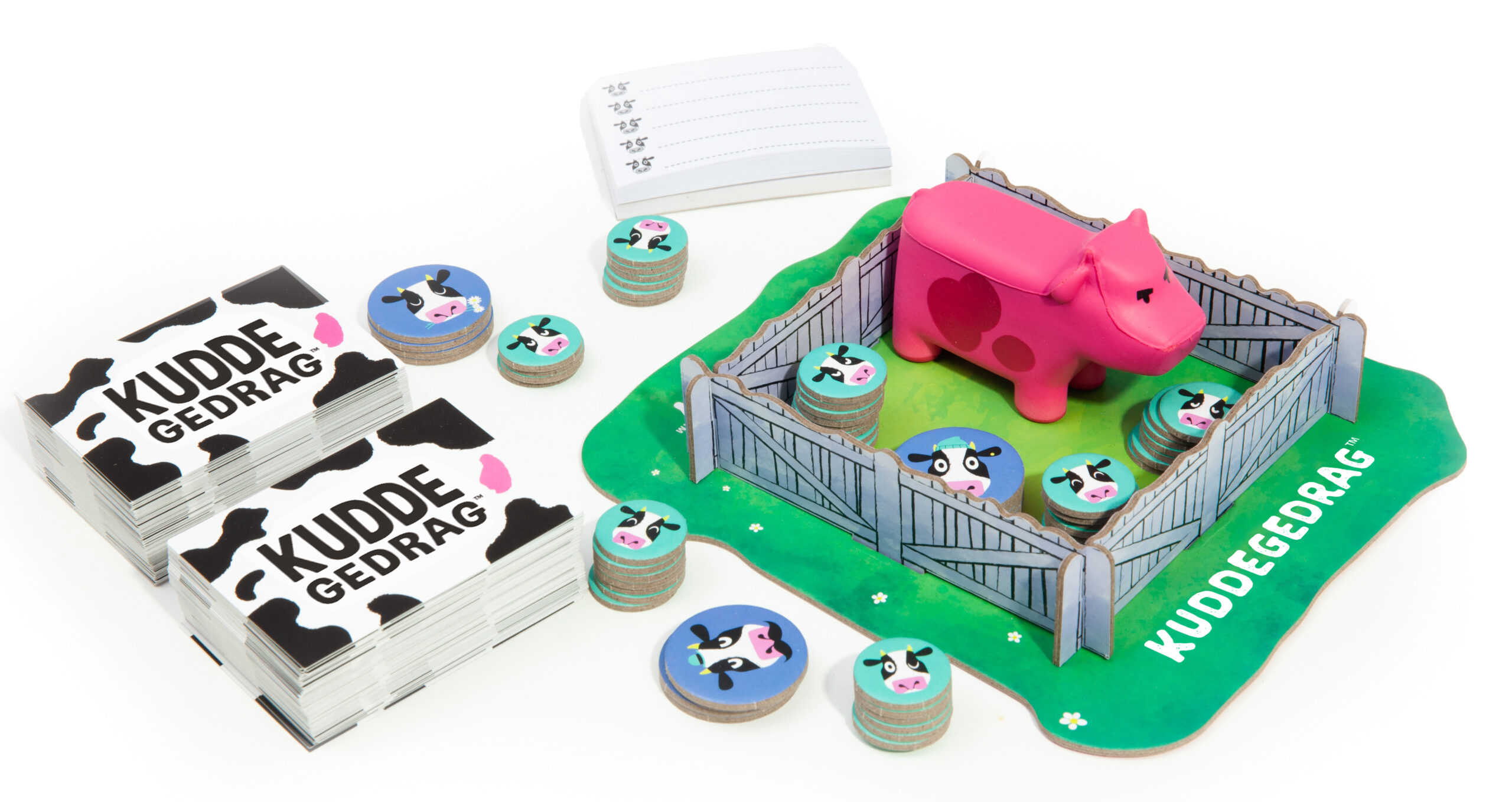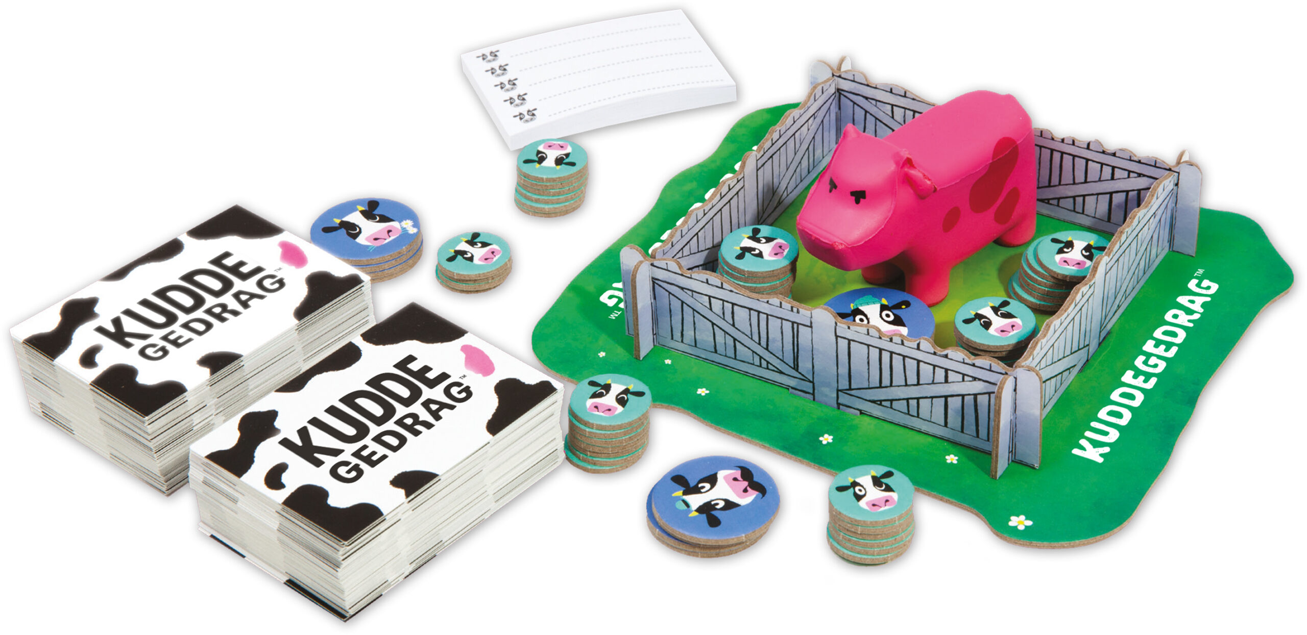100 dubbelzijdige kaarten, 1 roze koe, 62 koefiches, 1 blokje antwoordblaadjes, 1 weide, spelregels
