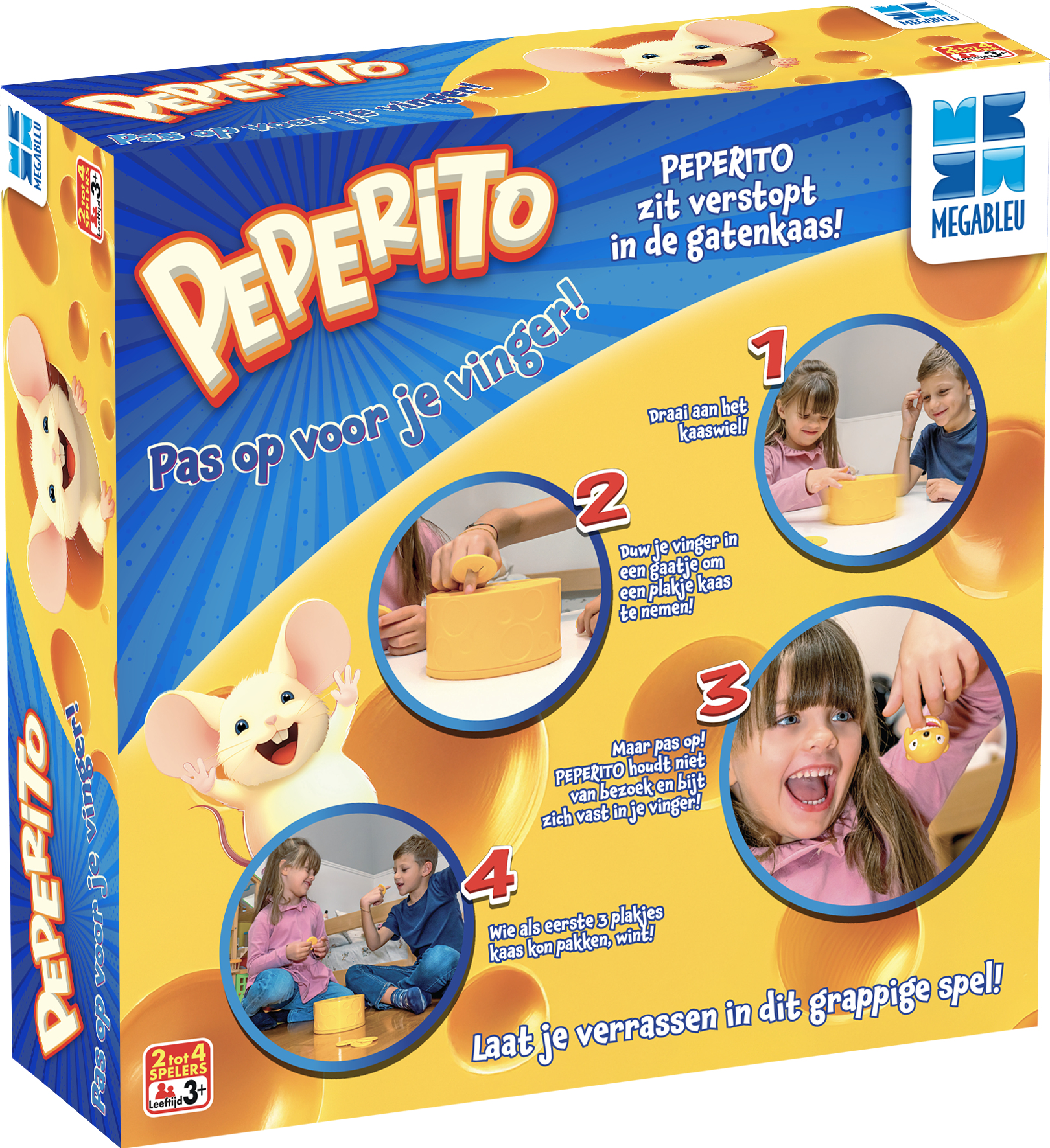 Peperito zit verstopt in het kaaswiel… maar waar precies? Draai aan het kaaswiel en steek je vinger in een gaatje om een plakje kaas te stelen. Maar pas op! Peperito is dol op zijn kaas en deelt niet graag… Voor je het weet, bijt hij zich vast in je vinger! Wie als eerste 3 plakjes kaas weet te pakken zonder gebeten te worden, wint het spel! Peperito is een grappig en spannend spel voor kinderen vanaf 3 jaar. De speelse spanning en onvoorspelbaarheid zorgen keer op keer voor veel gelach en plezier.